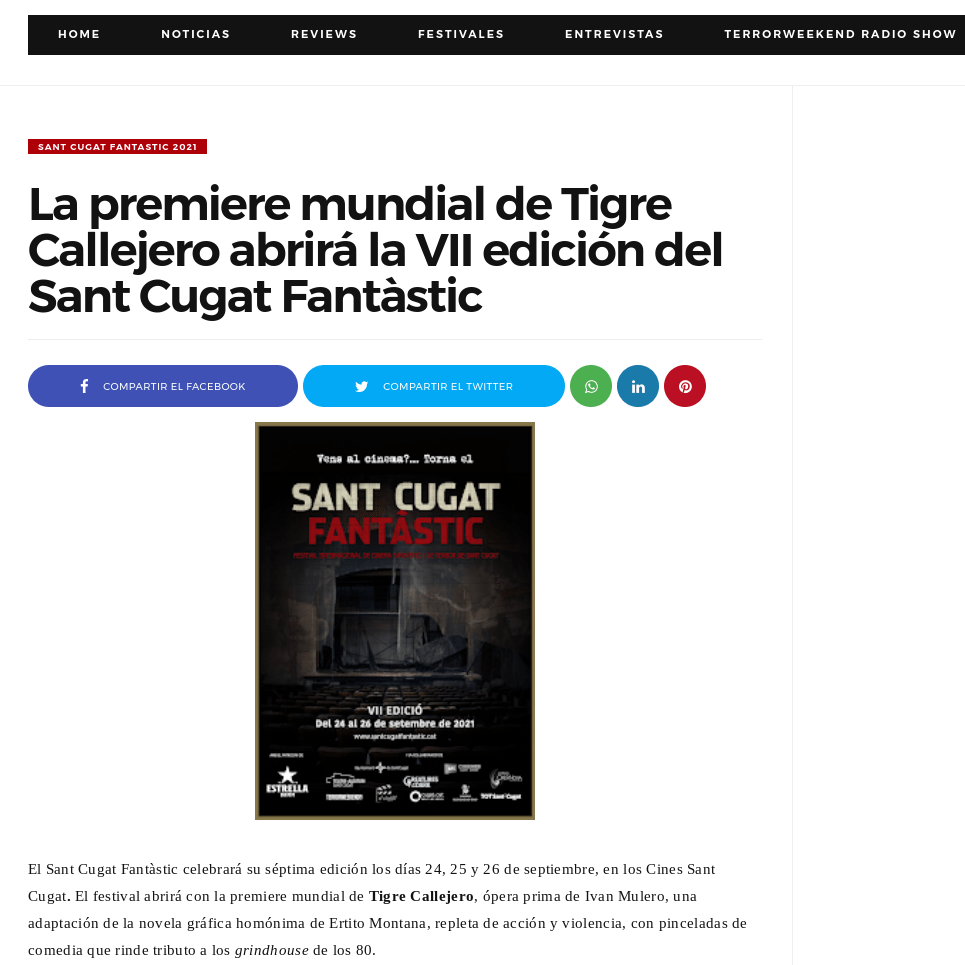 El Sant Cugat Fantàstic celebrará su séptima edición los días 24, 25 y 26 de septiembre, en los Cines Sant Cugat. El festival abrirá con la premiere mundial de Tigre Callejero, ópera prima de Ivan Mulero, una adaptación de la novela gráfica homónima de Ertito Montana, repleta de acción y violencia, con pinceladas de comedia que rinde tributo a los grindhouse de los 80