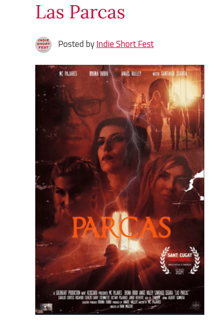 “Las Parcas”, a story written by Maria Cielo Pajares, produced by Bruna Rubio, and directed by Ivan Mulero, captivated the public at Sant Cugat Fantastic. The spectacular script for the short “Las Parcas” is based on the Roman mythology of three dark goddesses of fate: ATROPOS (MC Pajares), LAQUESIS (Bruna Rubio) and CLOTO (Anaïs Valley), who are sent by HADES (Santiago Segura), the god of the underworld, to steal the soul of MAN (Ricardo Cerezo), who is protected by his GUARDIANANGEL (Carlos Cortés).