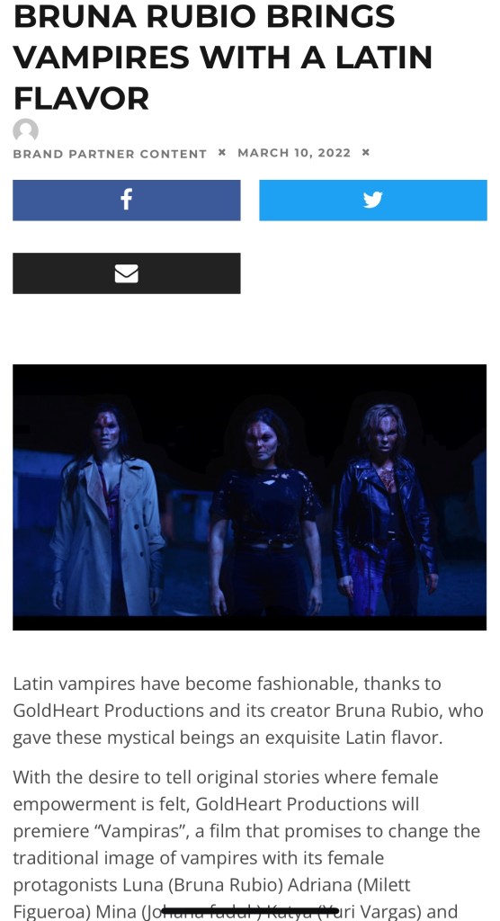 “Vampiras”, with characters from the underworld, will steal the hearts of all Sci – Fi movie fans. In addition to creating this great story, GoldHeart productions, in its mission to support women behind the camera in the film industry brought together a talented crew, mostly women, who contributed to the film with a female view and energy that is eating up the film industry. The crew, Executive Producer: Bruna Rubio, Production Manager: Anais Valley, Cinematographer: Aina Graupera, Makeup-FX: Belen Cortes, Second Unit Director and Line Producer: Diana Sarmiento, Makeup: Pilar Pascual, Location Manager: Victoria Medrano, Script supervisor: Sara Pons and other females want to continue telling stories together and proving that women can get ahead in a cinematic world that is changing in favor of equality and diversity .